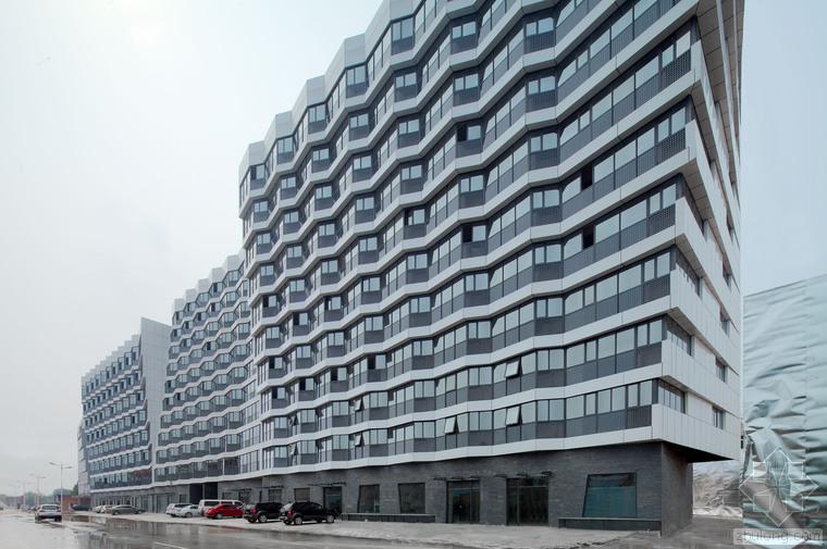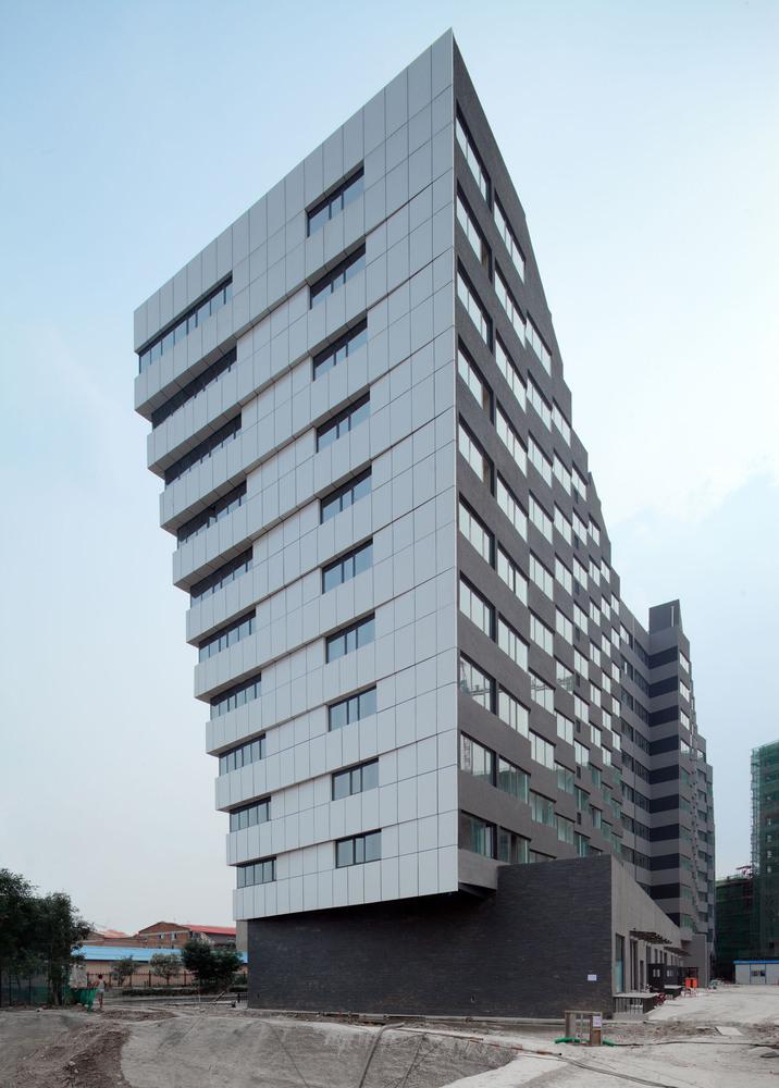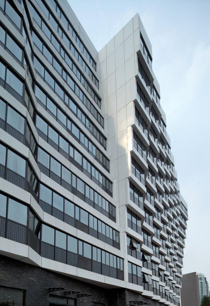 建筑的底層是展廳和商業(yè)。公寓部分在二層以上,大約占總建筑面積的三分之二,因分屬于三個(gè)投資人,業(yè)主希望從形式上有區(qū)分,突出各自的獨(dú)立性。我們以公寓面寬為基準(zhǔn)定義出一個(gè)標(biāo)準(zhǔn)戶型的外觀形式,在南立面上進(jìn)行重復(fù),通過(guò)基本單元有序的懸挑形成錯(cuò)動(dòng),發(fā)展出水平和垂直方向富有動(dòng)感的體量變化,進(jìn)而強(qiáng)調(diào)出辦公和兩部分公寓的清晰分界。于是集合體明確地呈現(xiàn)出四部分,一個(gè)底座和上面三個(gè)起伏的體塊,為內(nèi)容的不同提供了明顯的標(biāo)識(shí)。