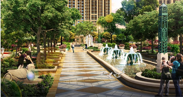 整個建筑規(guī)劃呈現(xiàn)沿中軸對稱布置的規(guī)劃手法,意在打造強烈的禮儀感規(guī)劃布局,營造舒適的空間氛圍。結(jié)合規(guī)劃布局特點,打造對稱規(guī)則的中央景觀,切合禮儀感的規(guī)劃特點。